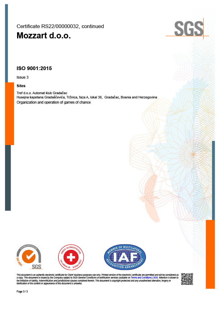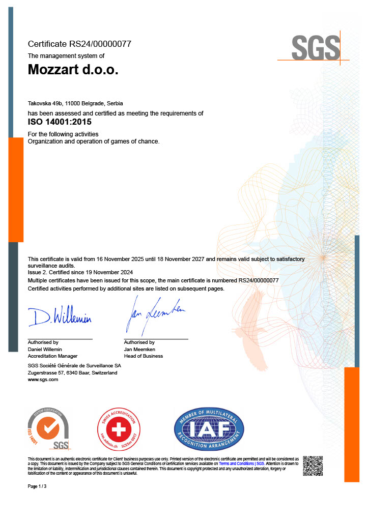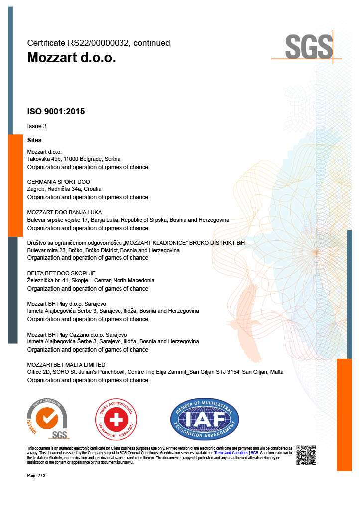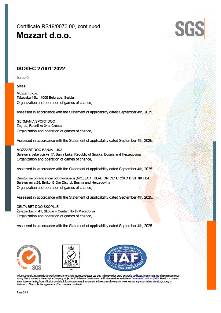 Za sljedeće aktivnosti: Organizovanje igara na sreću, u skladu sa Izjavom o primjenjivosti od 16. septembra 2022. godine.