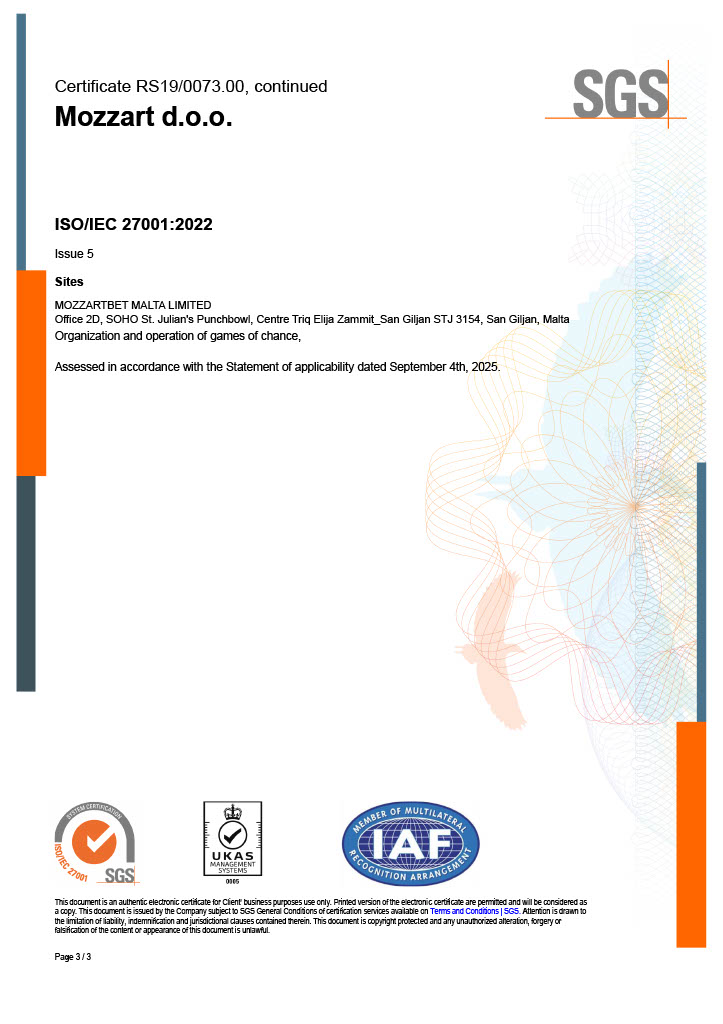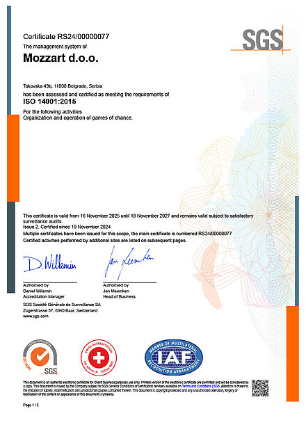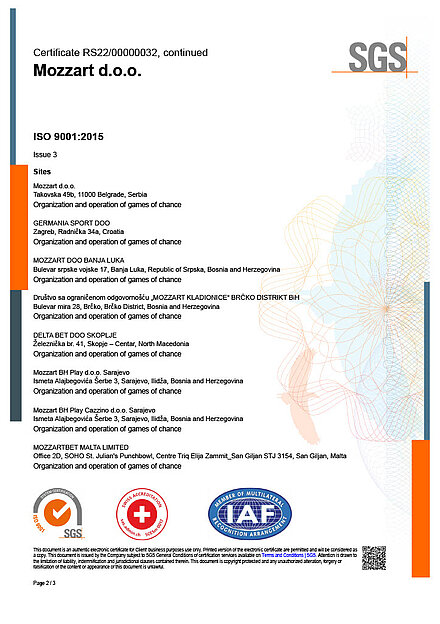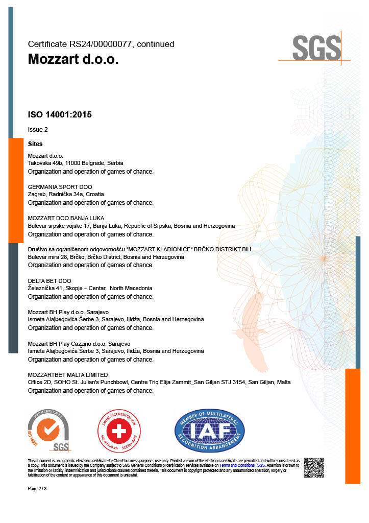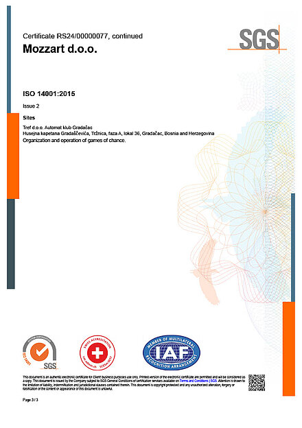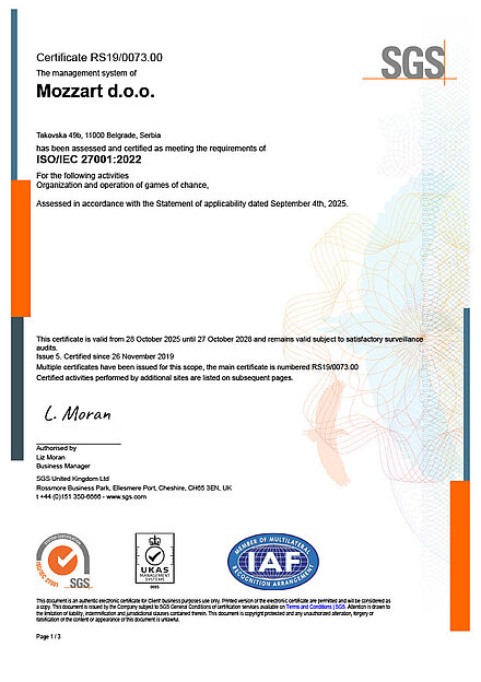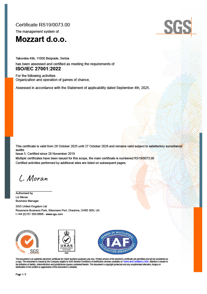 Za sljedeće aktivnosti: Organizovanje igara na sreću, u skladu sa Izjavom o primjenjivosti od 16. septembra 2022. godine.
